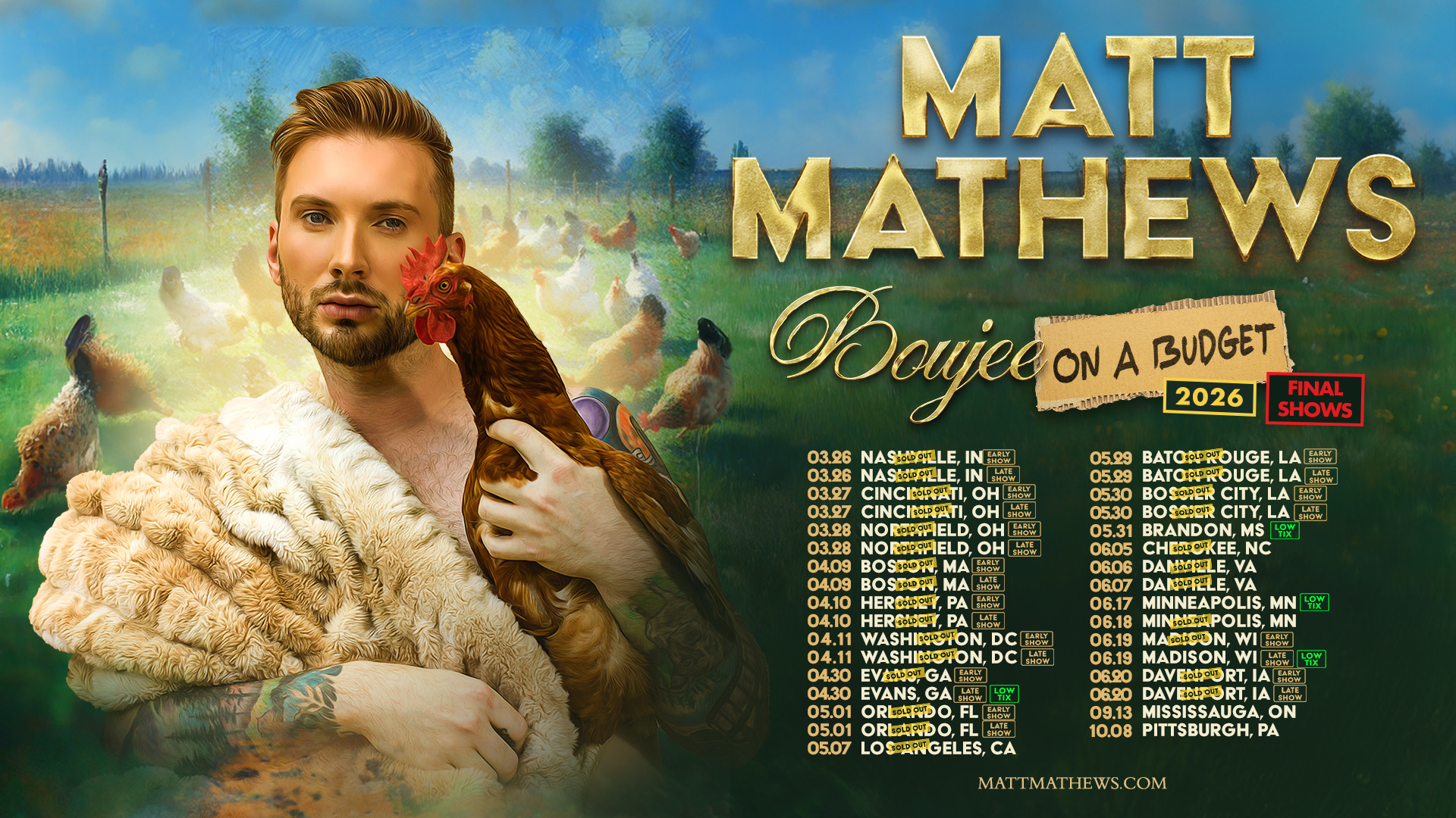 Whether on stage, on the farm, or in the recording studio, Matt Mathews is proving himself to be much more than a comedian—he’s a fearless entertainer and storyteller redefining what it means to be boujee on a budget